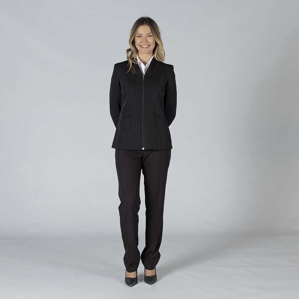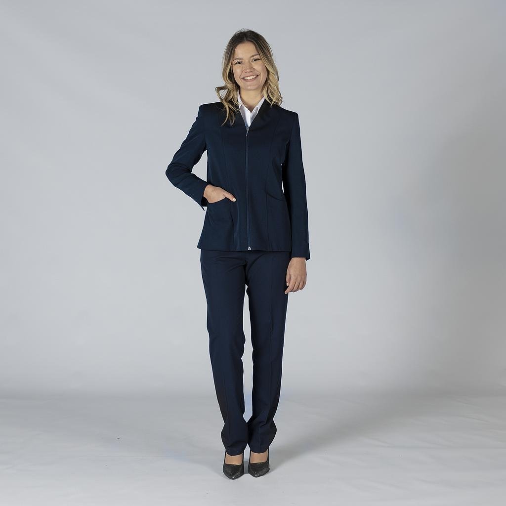 La americana está fabricada con un tejido TRIVIAL que garantiza resistencia al desgaste y una larga vida útil. La combinación de poliéster, viscosa y elastano proporciona un equilibrio ideal entre comodidad y durabilidad.Esta prenda presenta un diseño elegante con cuello chimenea y una cremallera invertida en el centro delantero. La cremallera no solo añade un toque de estilo, sino que también permite un cierre seguro y rápido.La chaqueta de traje está forrada en su interior, lo que mejora la comodidad y la sensación al llevarla puesta. El forro añade un nivel adicional de calidad a la prenda.Cuenta con dos bolsillos en las caderas que están cuidadosamente insertados en la costura. Estos bolsillos proporcionan un espacio conveniente para guardar pequeños objetos mientras se trabaja.Puedes elegir entre dos colores versátiles: negro y marino. Estos colores son adecuados para mantener una apariencia profesional en una variedad de entornos laborales.