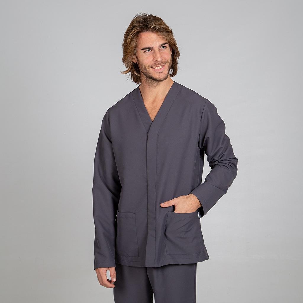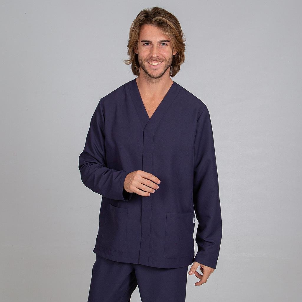 Casaca Hombre Néstor, diseñada para profesionales de la salud y la industria alimentaria. Esta prenda de manga larga presenta un elegante cuello pico y se cierra mediante botones de presión ocultos, proporcionando un aspecto pulcro y moderno. La casaca, semi ajustada, cuenta con dos bolsillos de parche en la parte delantera y presenta pinzas en la espalda y aberturas laterales para un ajuste cómodo y favorecedor.