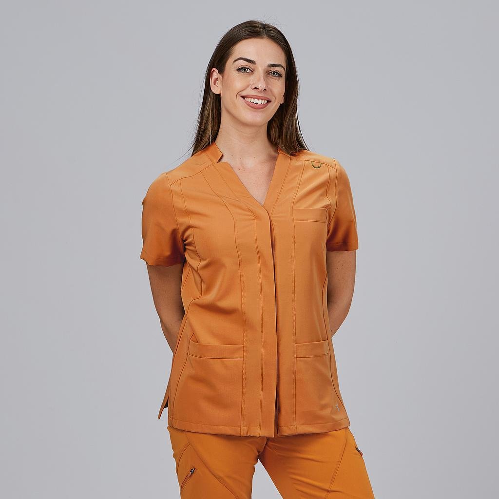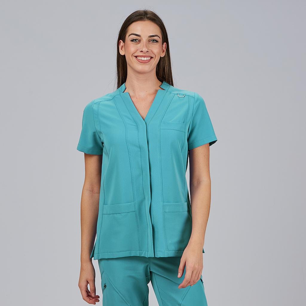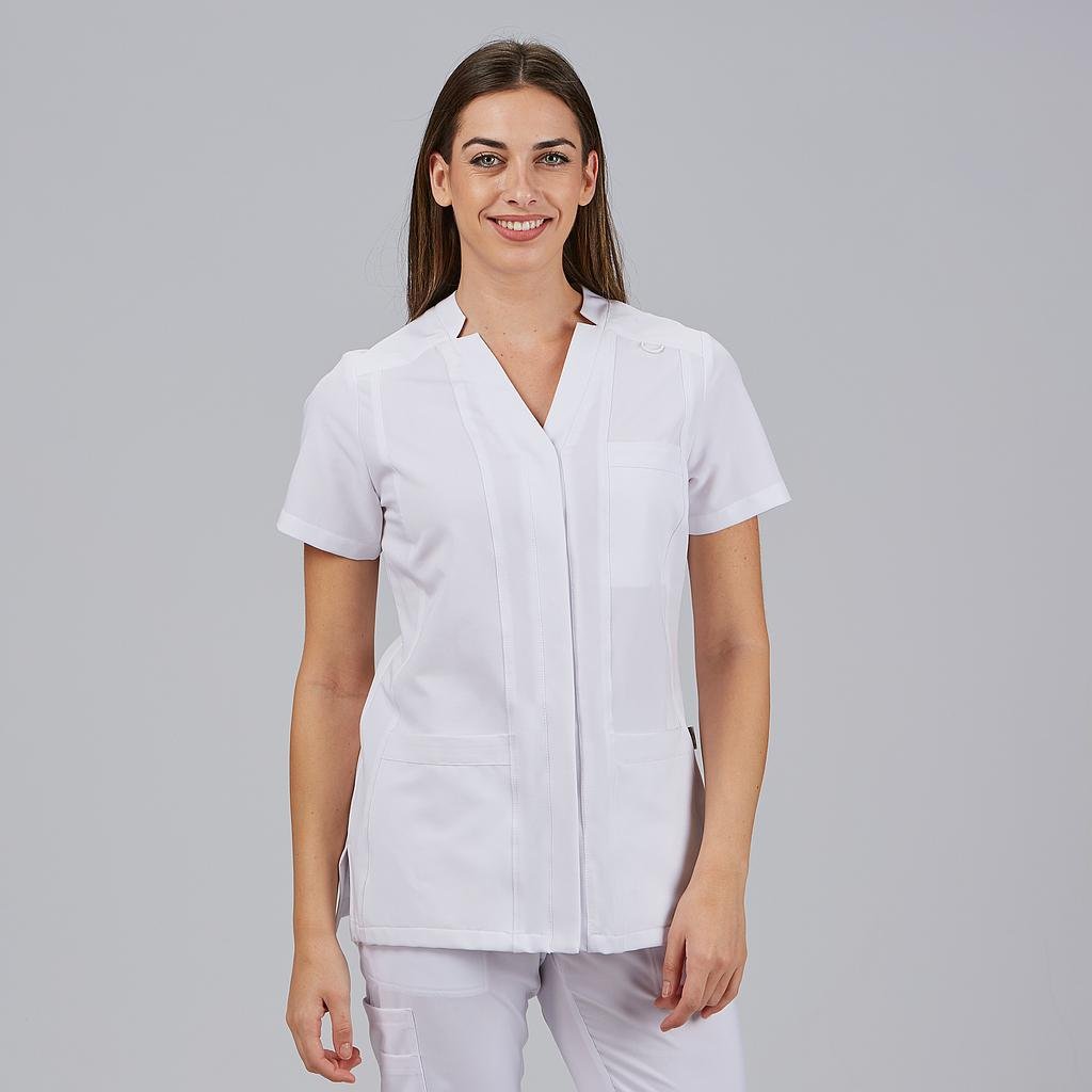 La Blusa Mujer Abierta M/C MARLA combina diseño moderno, máxima comodidad y respeto por el entorno. Con un corte M2 semi ajustado y un largo de 71 cm aprox., esta prenda es perfecta para mujeres profesionales que buscan libertad de movimiento sin perder estilo. Ideal para sectores como sanidad, farmacia, estética, laboratorio o atención al público.Confeccionada en el tejido técnico IRIS 74% PES RECYCLED 24% RY 2% EA – 180 gr/m², ofrece un rendimiento óptimo: es ligera, elástica, transpirable y de secado rápido, además de ser una opción ecológica y consciente con el planeta.El diseño incorpora un cuello con efecto solapa invertida, que aporta un toque diferenciador y profesional. Incluye manga corta, cierre frontal con botones de presión ocultos, canesú en delantero y espalda y canalé elástico en la parte trasera, que mejora el ajuste anatómico sin sacrificar la libertad de movimiento. Sus 3 bolsillos delanteros funcionales permiten llevar siempre a mano todo lo necesario durante la jornada.Colores disponibles:Negro (C/001) | Blanco (C/101) | Turquesa (C/115) | Camel (C/151) | Verde Musgo (C/154) | Nude (C/157) | Azul Profundo (C/165) | Azul Maya (C/169) | Caldera (C/174)Pantalón a juego: 700074.Versión hombre: 600088.