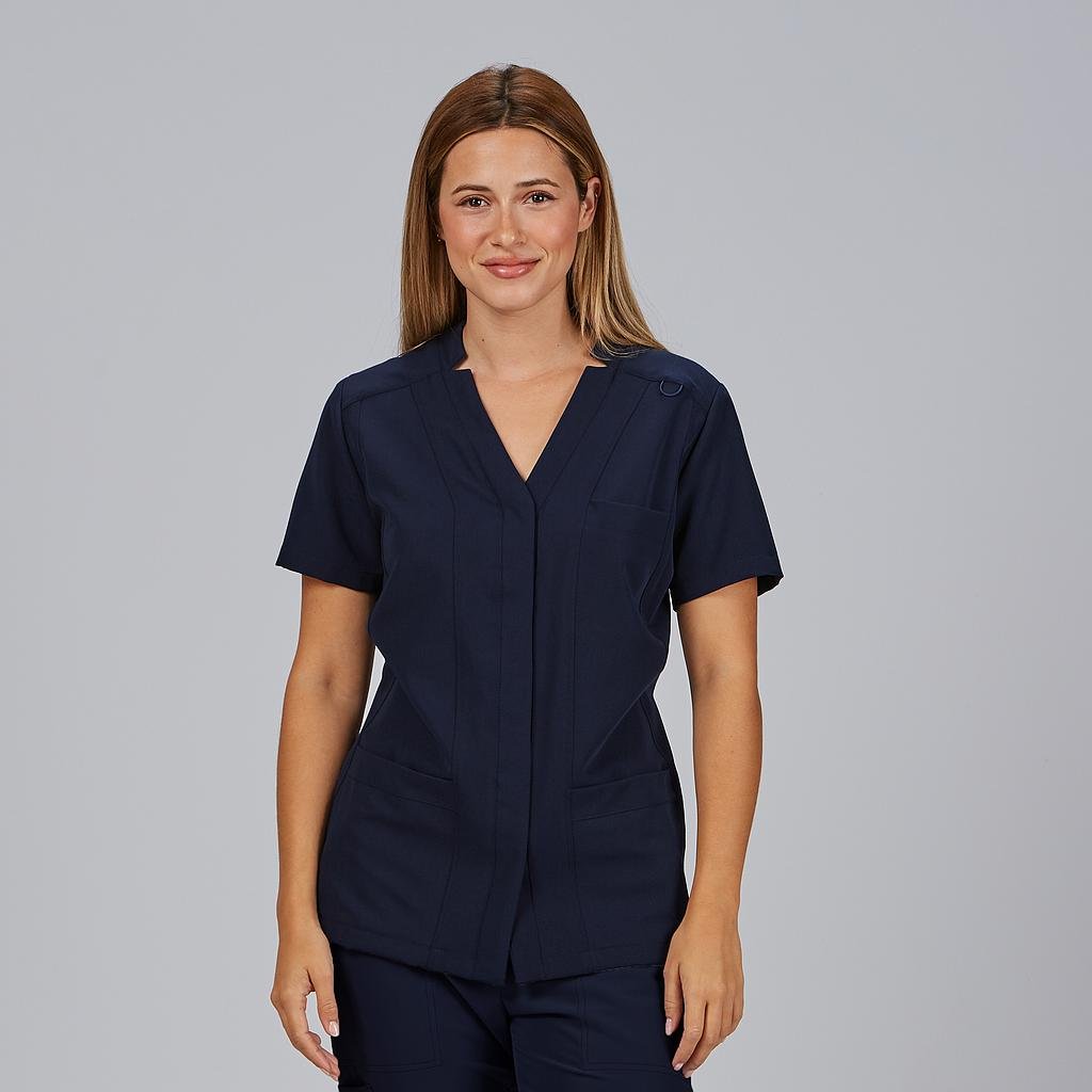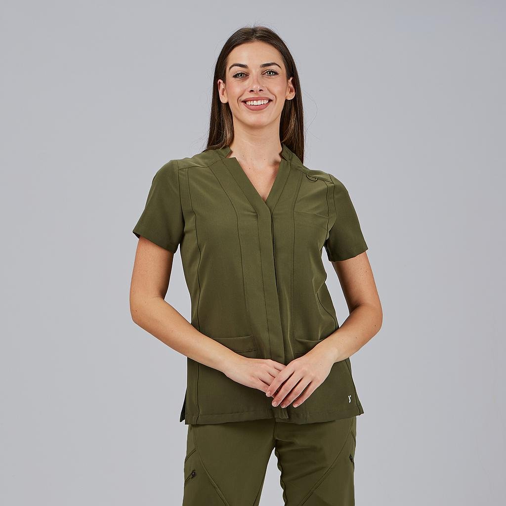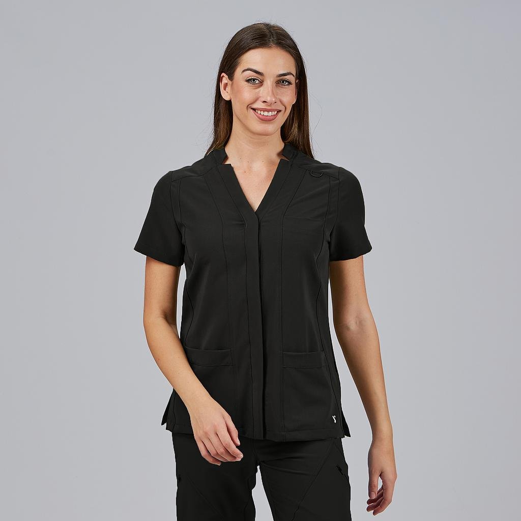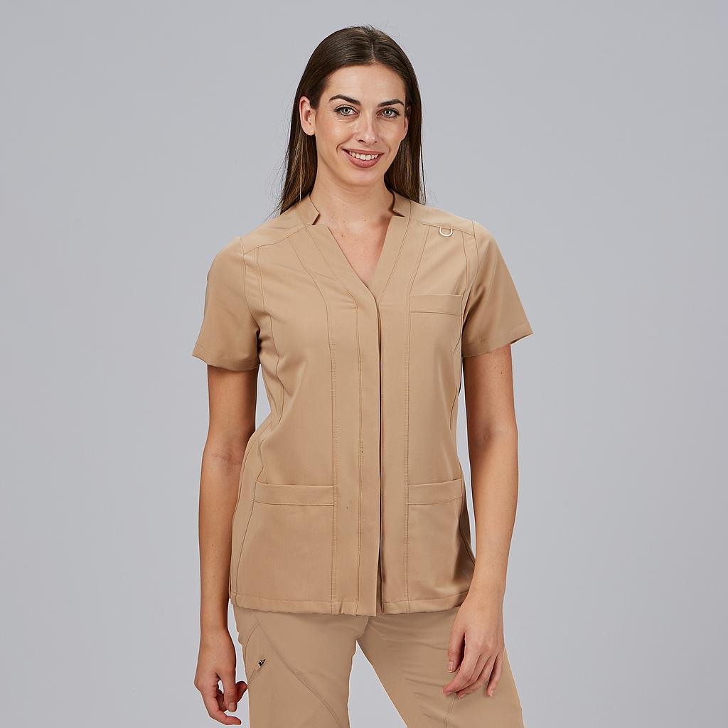 La Blusa Mujer Abierta M/C MARLA combina diseño moderno, máxima comodidad y respeto por el entorno. Con un corte M2 semi ajustado y un largo de 71 cm aprox., esta prenda es perfecta para mujeres profesionales que buscan libertad de movimiento sin perder estilo. Ideal para sectores como sanidad, farmacia, estética, laboratorio o atención al público.Confeccionada en el tejido técnico IRIS 74% PES RECYCLED 24% RY 2% EA – 180 gr/m², ofrece un rendimiento óptimo: es ligera, elástica, transpirable y de secado rápido, además de ser una opción ecológica y consciente con el planeta.El diseño incorpora un cuello con efecto solapa invertida, que aporta un toque diferenciador y profesional. Incluye manga corta, cierre frontal con botones de presión ocultos, canesú en delantero y espalda y canalé elástico en la parte trasera, que mejora el ajuste anatómico sin sacrificar la libertad de movimiento. Sus 3 bolsillos delanteros funcionales permiten llevar siempre a mano todo lo necesario durante la jornada.Colores disponibles:Negro (C/001) | Blanco (C/101) | Turquesa (C/115) | Camel (C/151) | Verde Musgo (C/154) | Nude (C/157) | Azul Profundo (C/165) | Azul Maya (C/169) | Caldera (C/174)Pantalón a juego: 700074.Versión hombre: 600088.