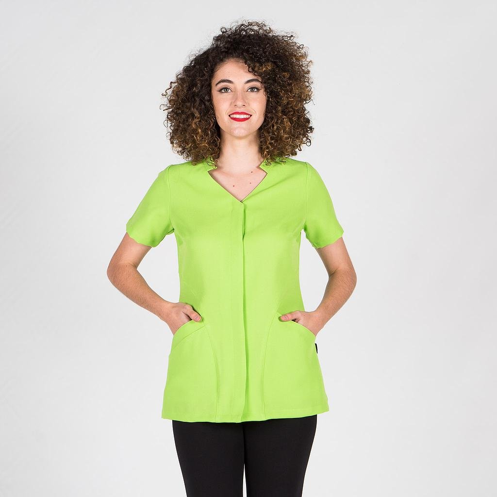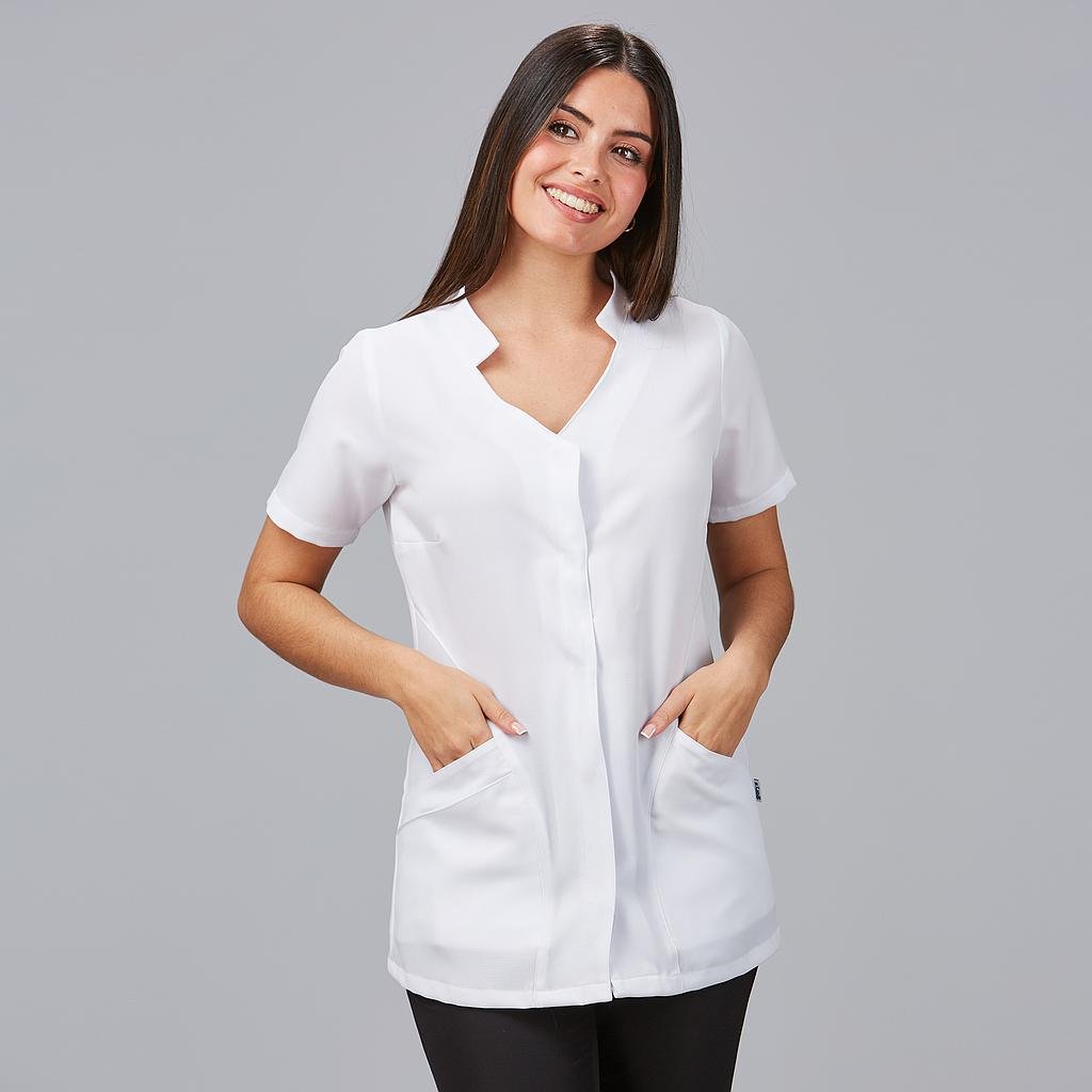 Descubre la elegancia y la comodidad de la blusa para mujer Adelfa, una prenda diseñada para destacar en el entorno laboral de peluquerías y centros de estética. Esta casaca de manga corta presenta un cuello tirilla y un escote en pico, proporcionando un toque moderno y femenino.El cierre mediante botones de presión ocultos y los dos bolsillos laterales, uno de ellos doble, agregan practicidad a esta prenda semiajustada. Las pinzas en las sisas y la espalda garantizan un ajuste favorecedor y cómodo, realzando tu figura con estilo.Esta blusa fabricada en PLANA POLIÉSTER 100%PES – 165gr/m² ofrece versatilidad y durabilidad. Es ideal para profesionales de peluquería, estética, spa, sanitarios, farmacias, veterinarios o cualquier entorno comercial. Eleva tu imagen con esta prenda que combina funcionalidad y moda, proporcionando el equilibrio perfecto para tu jornada laboral.Colores disponibles:Negro (C/001)Pantalón a juego: 203600.
