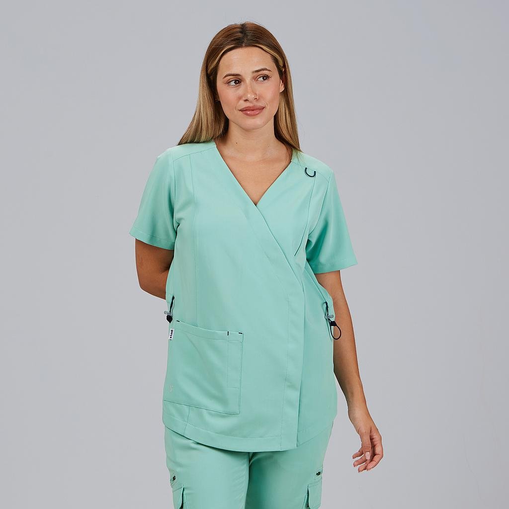 La Blusa Mujer Fruncido Espalda M/C ELIRA combina un diseño funcional con un ajuste favorecedor y tejido técnico sostenible, perfecta para profesionales que buscan comodidad, estilo y responsabilidad ambiental. Con un corte semi ajustado (M2) y una longitud de 69 cm aprox., es ideal para sectores como sanidad, estética, farmacia, clínicas o recepción.Fabricada en tejido IRIS 74% PES RECYCLED 24% RY 2% EA – 180 gr/m², esta blusa es ligera, elástica, transpirable y de fácil mantenimiento, ideal para el uso diario intensivo. Su escote en V cruzado y el cierre asimétrico con botones de presión ocultos aportan un estilo moderno y elegante sin renunciar a la practicidad.Incluye costadillos delanteros que estilizan la figura, un bolsillo tipo patch con compartimento para bolígrafos y un elástico ajustable en la parte central de la espalda, que mejora la adaptabilidad de la prenda a distintos tipos de cuerpo y aporta mayor confort.Colores disponibles:Negro (C/001) | Blanco (C/101) | Agua Marina (C/143) | Verde Musgo (C/154) | Nude (C/157) | Caldera (C/174)Pantalón a juego: 700081.