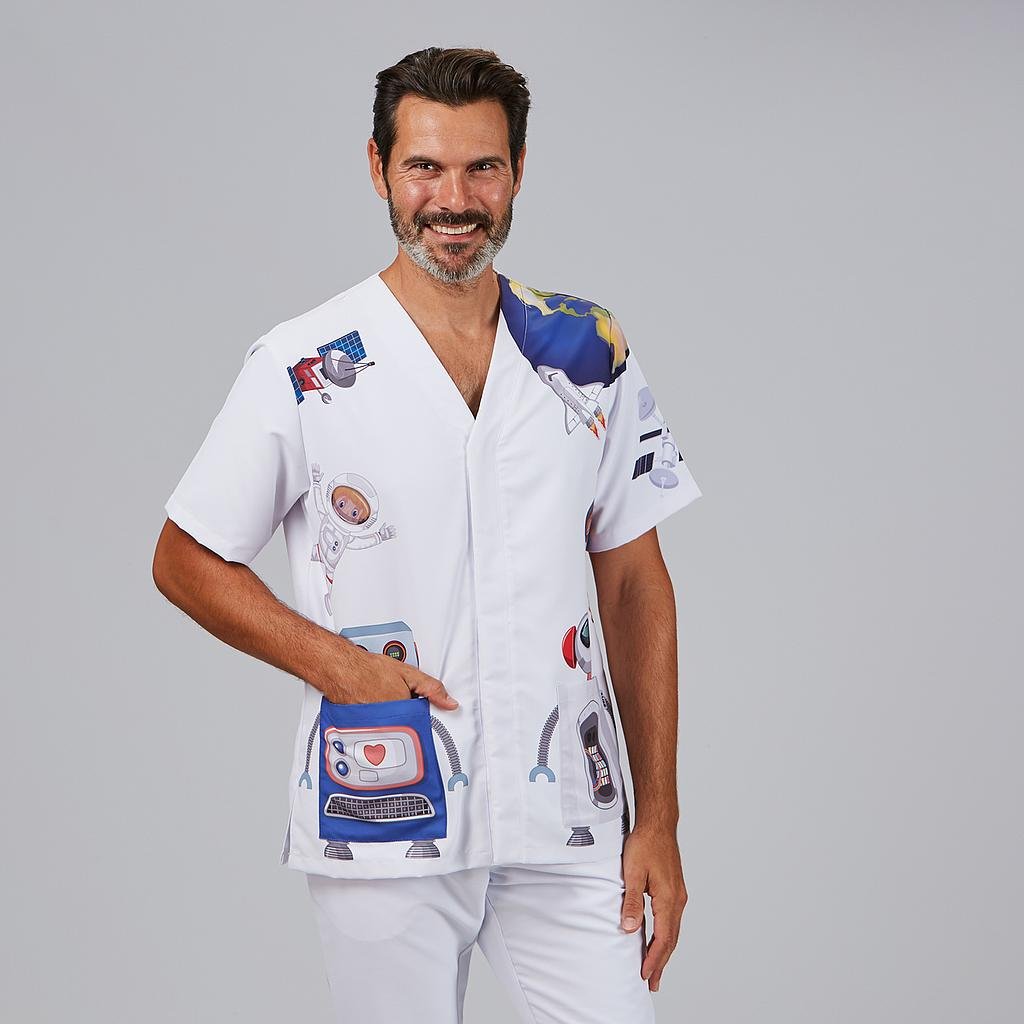 Casaca Unisex Amaia, diseñada para profesionales de la salud y aquellos en la industria de la alimentación. Esta prenda de manga corta presenta un elegante cuello pico y un cierre discreto mediante botones de presión ocultos, combinando funcionalidad y estilo. La holgada blusa incluye dos bolsillos de parche delanteros y aberturas laterales para un ajuste cómodo y ventilación adicional.La Casaca Amaia está disponible en blanco, estampada con dos encantadores diseños: niños con globos o adorables perros. Fabricada en MICROFIBRA 100% PES – 148 gr/m², este tejido antibacterias es altamente transpirable, resistente a salpicaduras de lejía y lavable a 90º. Además, ofrece secado rápido, sin necesidad de planchado y repelencia al cabello y pelo de mascotas. Colores disponibles:Niños (C/2892) | Deseo (C/2924) | Astronauta (C/2925) | Helio (C/2928) | Stickers (C/2936)