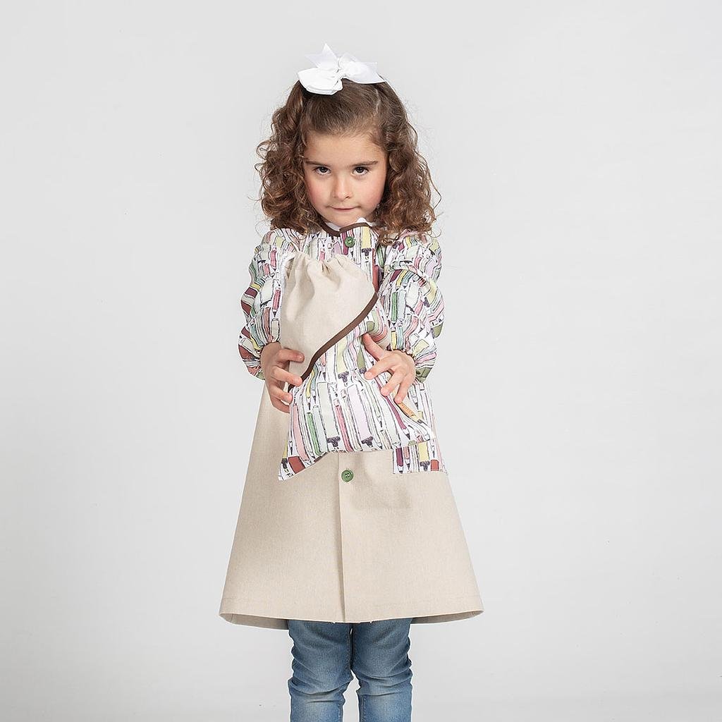 La bolsa ROTUS presenta un diseño en color beige combinado con un estampado de rotuladores. Este diseño coordinado con el babi referencia 300014 le da un aspecto único y atractivo que seguramente llamará la atención.