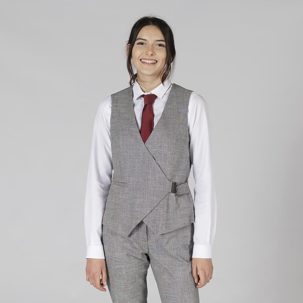 El chaleco está confeccionado en un tejido de alta calidad que consiste en un 97% de algodón y un 3% de elastano. Esta combinación de materiales proporciona comodidad y durabilidad, lo que garantiza que la prenda soporte las demandas del trabajo diario.El chaleco presenta un diseño cruzado elegante que se cierra con una hebilla. Esta característica no solo agrega estilo, sino que también permite un ajuste personalizado para mayor comodidad.La prenda cuenta con forro en su interior, lo que aumenta la comodidad al llevarla puesta y contribuye a una sensación de calidad.El chaleco está diseñado con atención a los detalles, incluyendo un cierre delantero derecho sobre izquierdo, pespunte de carga interior en el escote, cantos laterales y sisas, y una cola de ratón en el canto izquierdo. Estos detalles no solo añaden un toque de elegancia, sino que también aseguran la durabilidad de la prenda.El chaleco dispone de un bolsillo de vivo en el delantero derecho, lo que permite un acceso conveniente a objetos pequeños o herramientas de trabajo. Además, cuenta con un bolsillo en el interior izquierdo que agrega funcionalidad a la prenda.
