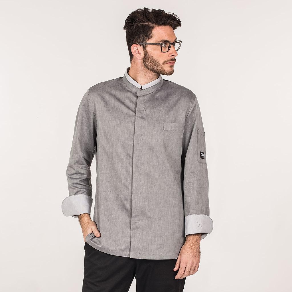 Chaqueta GASTROCHEF unisex, en manga larga, con cuello mao, puños vueltos, cierre central mediante botones de presión ocultos y bolsillos en pecho y manga izquierda. Modelo semi ajustado, con costadillos en espalda.