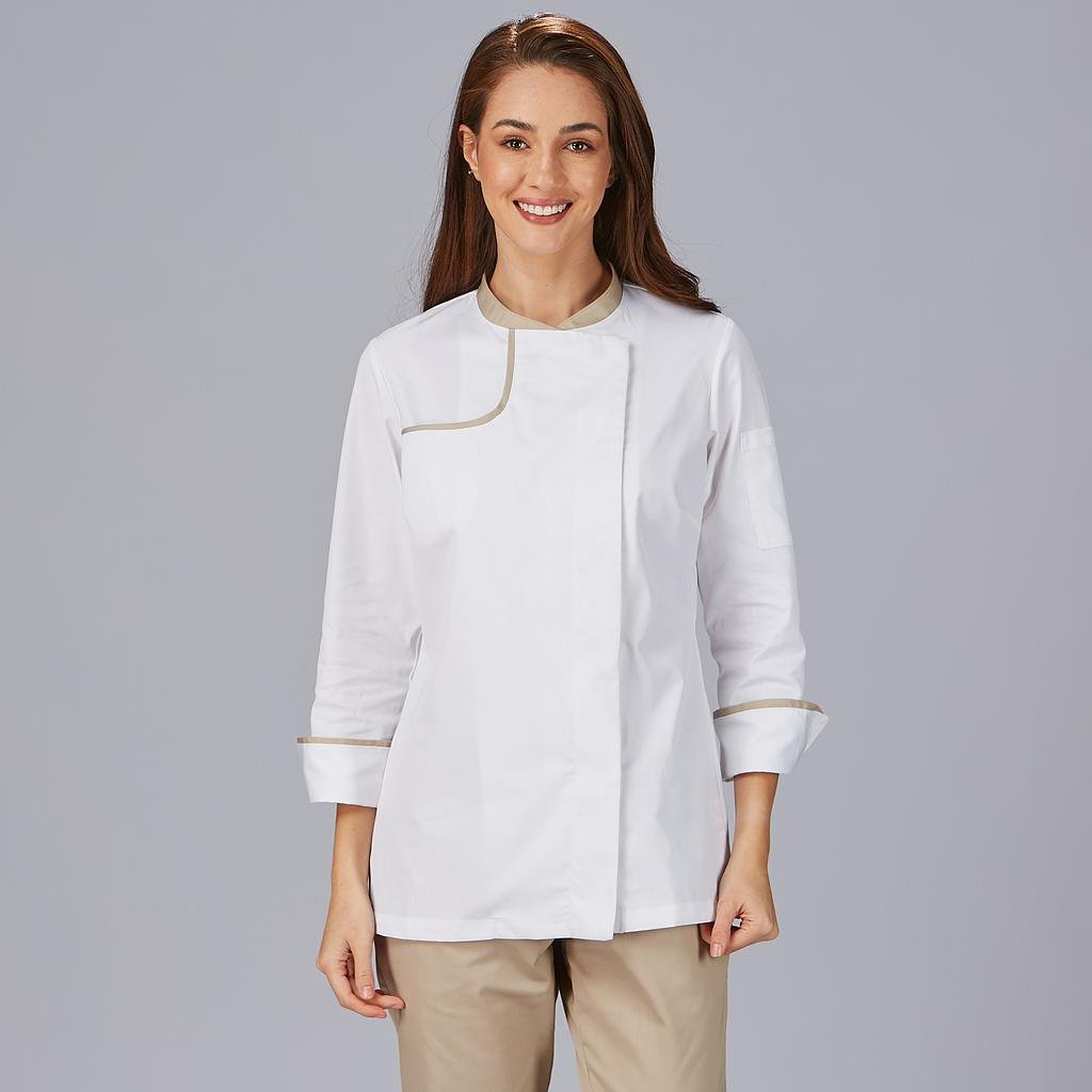 La chaqueta de cocina de mujer ANAYA presenta un diseño elegante con mangas largas y cierre cruzado mediante botones de presión ocultos. Esta combinación agrega un toque de sofisticación a la prenda, lo que es esencial para profesionales de la hostelería que desean lucir bien mientras trabajan.Los puños vueltos en las mangas largas permiten un ajuste personalizado en las muñecas, lo que brinda comodidad y la flexibilidad necesaria para realizar tareas culinarias con destreza.Esta chaqueta está confeccionada con tejido Klopmán en color blanco, compuesto por un 50% de poliéster reciclado y un 50% de algodón orgánico. Esto hace que la prenda sea respetuosa con el medio ambiente y una excelente elección dentro de la línea NATUREWEAR de Uniformes Gary´s.El tejido de la chaqueta ofrece resistencia a las manchas, lo que es esencial en un entorno de cocina donde las salpicaduras y manchas son comunes. Esto garantiza que la chaqueta se mantenga en buen estado durante un largo período de uso.La chaqueta se seca rápidamente y no requiere planchado, lo que ahorra tiempo y esfuerzo en el mantenimiento de la prenda.La inclusión de tejido técnico AEROSILVER en la espalda garantiza un ambiente de trabajo fresco y transpirable, lo que es vital en el entorno de cocina..La chaqueta de cocina ANAYA es una prenda de alta calidad que combina la elegancia, la comodidad y la sostenibilidad. Disponible también en modelo para hombre referencia 942500.
