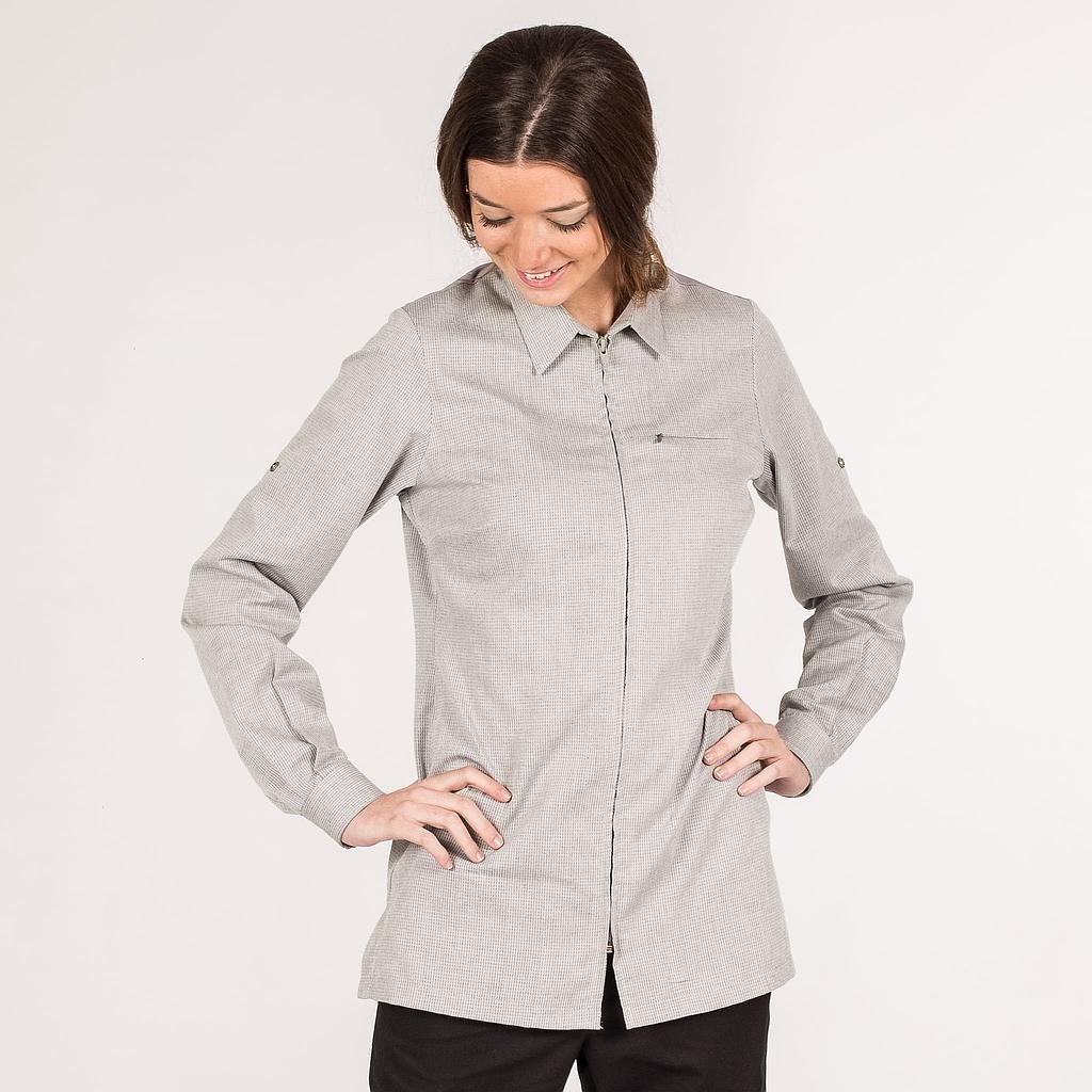 Chaqueta GASTROCHEF para mujer, en manga larga, con cuello camisero, cierre central mediante cremallera con separador, un bolsillo en pecho izquierdo con cremallera y mangas roll up con corchete. Modelo semi ajustado, con costadillos en espalda, pinzas en el pecho y aberturas laterales.