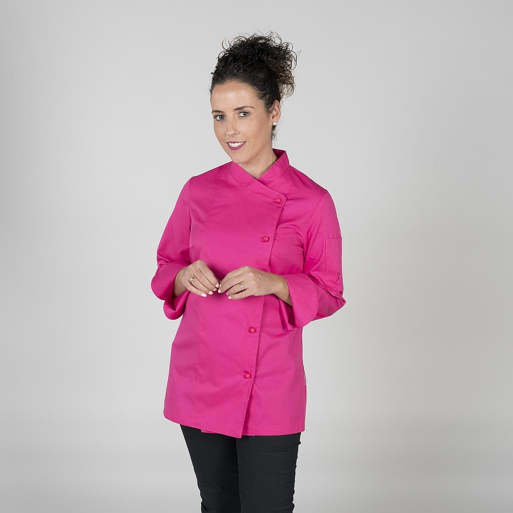Un cierre cruzado con botones de chupete al tono es una característica distintiva de esta chaqueta. Los botones se combinan perfectamente con el color de la chaqueta, lo que le brinda un aspecto elegante y uniforme.La chaqueta cuenta con un bolsillo en la manga izquierda, lo que proporciona un espacio adicional para guardar pequeños utensilios de cocina o herramientas esenciales.El diseño semi ajustado de la chaqueta incluye pinzas en el pecho y la espalda para un ajuste cómodo y una apariencia profesional.La chaqueta está confeccionada en tejido de sarga, conocido por su durabilidad y resistencia, y está disponible en varios colores para adaptarse a las preferencias personales o al estilo del restaurante.Esta chaqueta viene con los botones necesarios, lo que facilita su uso y garantiza un aspecto uniforme.La chaqueta de cocina de mujer CATANIA es la elección ideal para cocineras y chefs que desean una prenda de alta calidad que cumpla con las exigencias del entorno de cocina, al tiempo que ofrece una apariencia profesional y elegante.