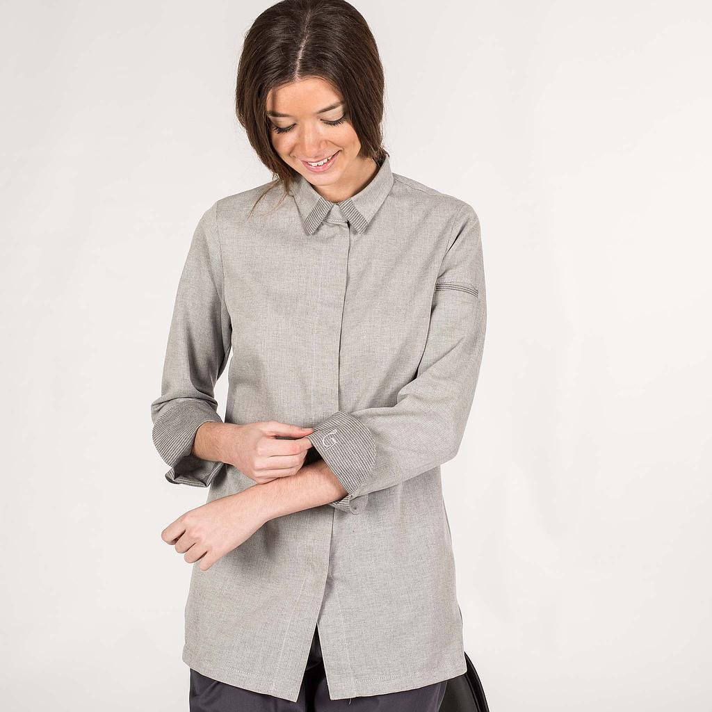 Chaqueta GASTROCHEF para mujer, en manga larga, con cuello camisero, cierre central mediante botones de presión ocultos, puños vueltos y un bolsillo en la manga izquierda. Modelo semi ajustado, con costadillos en espalda, pinzas en el pecho y aberturas laterales. Confeccionado en ESPIGA gris de 50% Poliéster – 50% Algodón y COOLMAX PIQUÉ en los costados. Ideal para uniforme de camareras, cocineras y chefs en hostelería, restauración y cocina en general o para comercio. Disponible también en modelo para hombre referencia 935200.
