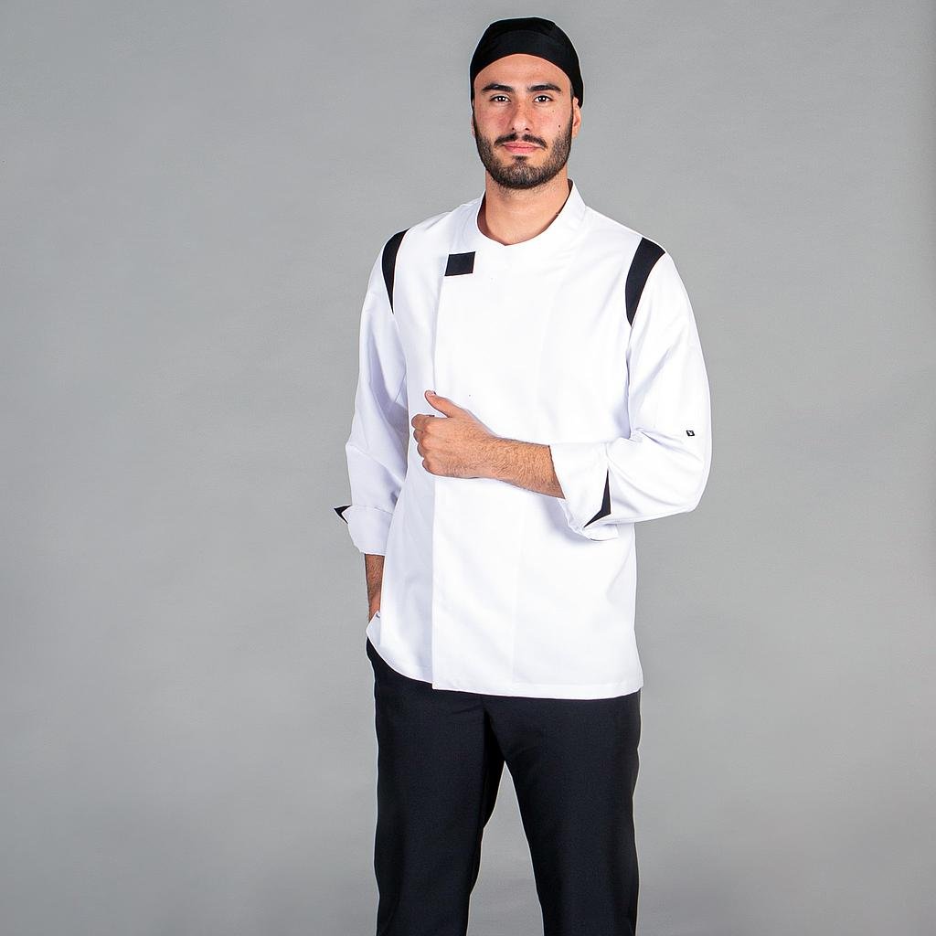 Esta chaqueta en manga larga presenta un diseño elegante y funcional con puños vueltos y cierre cruzado mediante botones de presión ocultos. El toque de sofisticación se combina con la practicidad requerida en los entornos de hostelería.