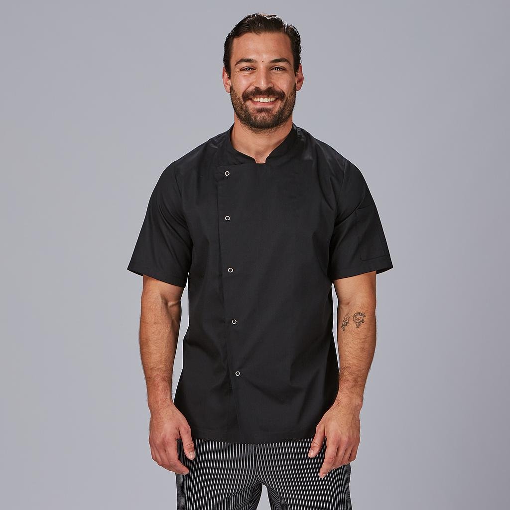 La chaqueta de cocina unisex LUQUE se presenta en una versión de manga corta que proporciona un aspecto fresco y cómodo para los días calurosos en la cocina o en el comedor. Esta versatilidad permite a los profesionales de la hostelería adaptar su uniforme a las condiciones climáticas.El diseño de cuello mao y el cierre cruzado mediante botones de presión vistos aportan un toque elegante y profesional a la chaqueta, lo que garantiza que el personal de hostelería luzca impecable y representativo en todo momento.La versatilidad de la chaqueta en versión unisex la hace adecuada para ambos géneros. Esto es ideal para mantener una apariencia uniforme y coordinada en todo el equipo de trabajo.Los costadillos en la espalda y la confección en sarga en colores blanco o negro aseguran que la chaqueta sea duradera y resista el desgaste diario del entorno de trabajo de la hostelería.La chaquetilla LUQUE es la elección perfecta para dueños de restaurantes, hoteles, bares y otros establecimientos de hostelería que desean que su personal luzca profesional, cómodo y preparado para enfrentar las demandas del servicio.