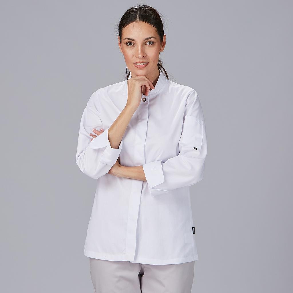 Diseñada específicamente para mujeres, esta chaqueta presenta un corte elegante y femenino que realza la figura mientras se mantiene cómoda durante todo el día.La manga larga con puños vueltos añade un toque de estilo a la vez que proporciona un ajuste cómodo en las muñecas.El bolsillo en la manga izquierda es una característica funcional que permite llevar pequeños utensilios de cocina o tomar notas de pedidos con facilidad.El cierre central mediante botones de presión ocultos con el primero de ellos a la vista es práctico y da un toque elegante a la chaqueta.El corte semi ajustado y los costadillos en la espalda, así como las pinzas en el pecho, ofrecen una apariencia profesional y permiten una movilidad sin restricciones.Fabricada en sarga, un tejido duradero y de fácil cuidado, esta chaqueta está disponible en colores blanco y negro para adaptarse a la preferencia individual.Incorpora tejido técnico Aerosilver en la zona de los costados, lo que proporciona propiedades antibacterianas y antimicrobianas, manteniendo la frescura y la higiene en el entorno de trabajo.La chaqueta de cocina de mujer VARELA es una elección excepcional para profesionales de la hostelería, camareras, cocineras y chefs que desean destacar en su entorno de trabajo. Además, también está disponible en un modelo para hombre, lo que la hace perfecta para un equipo de trabajo uniformado en su totalidad.