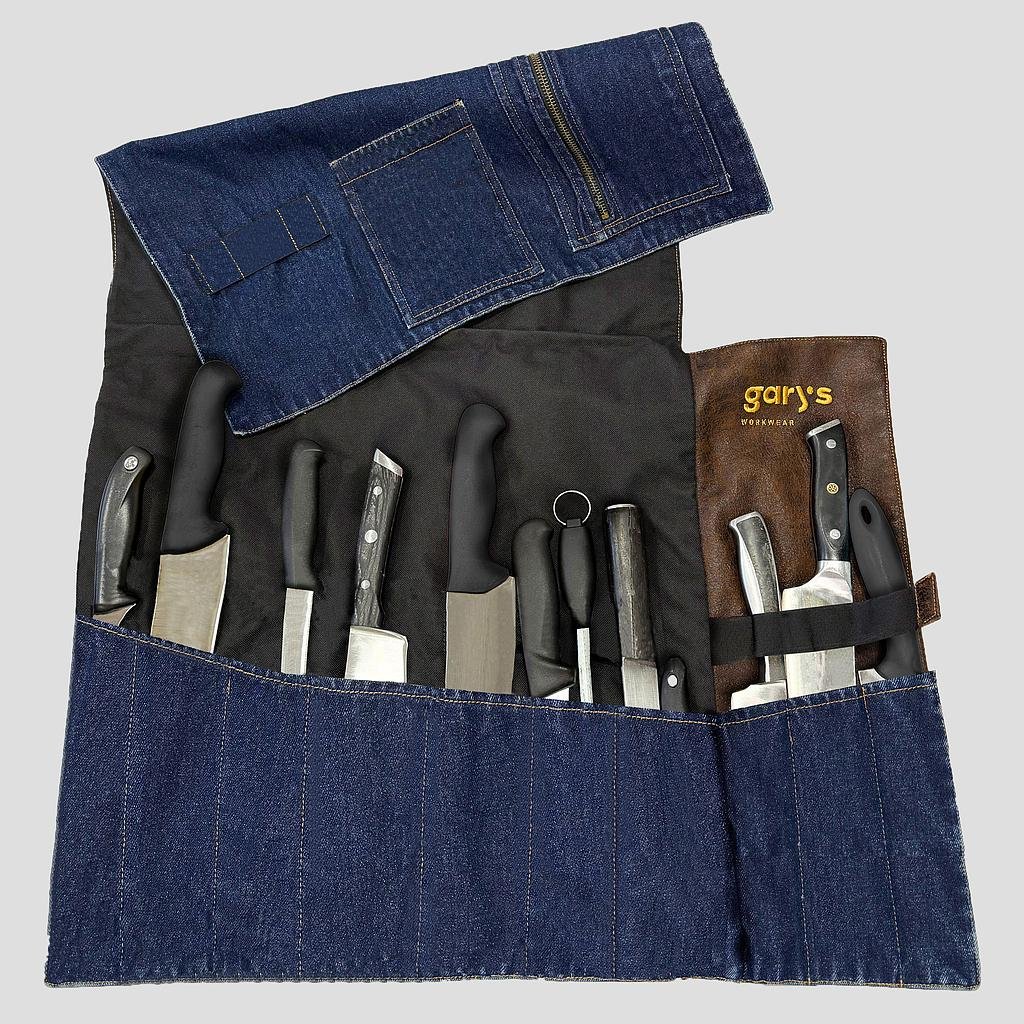 Organiza y protege tus herramientas de cocina con estilo con nuestra Cuchillera Profesional, una pieza imprescindible para chefs, cocineros y amantes de la gastronomía que valoran tanto la funcionalidad como la estética en su día a día.Diseñada para ofrecer máxima comodidad y seguridad en el transporte de cuchillos profesionales, esta cuchillera cuenta con 4 bolsillos reforzados, cierre con correa ajustable y herrajes metálicos en acabado plata vieja, que aportan un look moderno y profesional.Confeccionada en tejano azul 100% algodón y polipiel color arena, combina resistencia, fácil limpieza y una imagen cuidada, ideal para quienes buscan destacar también fuera de la cocina.* 4 bolsillos individuales para cuchillos o utensilios profesionales* Herrajes metálicos en plata vieja, resistentes y con estilo vintage* Cierre mediante correa, seguro y ajustable* Materiales: tejano azul 100% algodón + polipiel arena, resistentes y duraderos* Diseño elegante, práctico y fácil de transportarIdeal para chefs, cocineros, estudiantes de cocina y catering.
