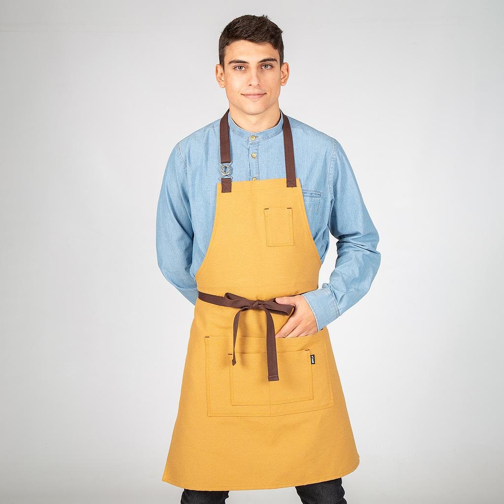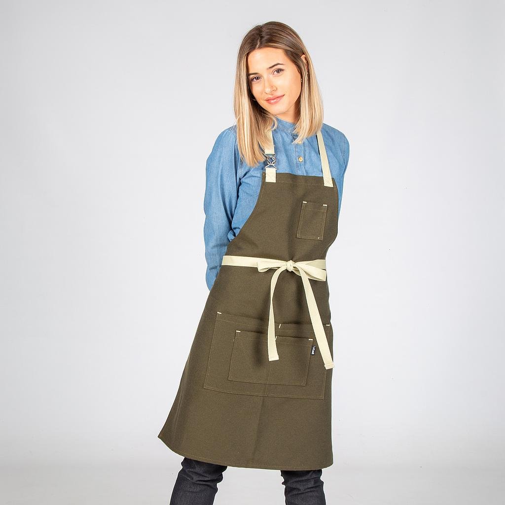 Este delantal es verdaderamente único gracias a su original cierre mediante una hebilla entrelazada en el tirante del cuello. Este detalle no solo agrega un toque de estilo exclusivo, sino que también asegura un ajuste seguro que permanecerá en su lugar durante toda su jornada laboral.Con cinco bolsillos en la parte delantera, este delantal ofrece una capacidad de almacenamiento excepcional. Los bolsillos permiten llevar consigo todo lo que necesitan, desde libretas de pedidos hasta utensilios esenciales, manteniéndolos siempre a su alcance.Valoramos su comodidad, y es por eso que hemos incorporado tiras laterales para anudar, permitiéndoles ajustar el delantal a su medida. Esto garantiza un ajuste cómodo y seguro que les permite moverse con facilidad durante su servicio.Este mandil está disponible en una variedad de colores, incluyendo albero, gris, rojo, verde caqui o gris marengo. Esto les brinda la oportunidad de elegir el tono que mejor refleje su estilo y se adapte a la estética de su establecimiento.Sabemos que su entorno de trabajo puede ser desafiante, por lo que hemos confeccionado este delantal con materiales de alta calidad que resisten el desgaste diario. Está diseñado para mantener su apariencia impecable incluso después de numerosos lavados y jornadas de servicio.