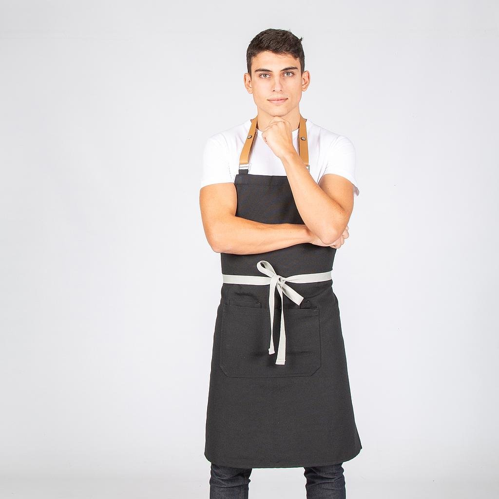 Este delantal con peto destaca por su diseño único y atractivo. El uso de cuero en el tirante del cuello le confiere un toque de distinción que refleja la profesionalidad y la atención al detalle que ustedes representan en la hostelería.Sabemos que su jornada laboral puede ser intensa, por lo que hemos equipado este delantal con tres bolsillos delanteros que ofrecen un amplio espacio para llevar consigo todo lo necesario. Desde libretas de pedidos hasta utensilios de cocina, este delantal asegura que tengan a mano lo que requieran en todo momento.Valoramos su comodidad, y por eso hemos incluido tiras laterales para anudar, permitiéndoles ajustar el mandil a su medida. Además, el tirante de cuero fijado mediante botones de presión garantiza un ajuste seguro que les permitirá trabajar con confianza.Este delantal está disponible en una variedad de colores: negro, turquesa, albero o verde caqui. Esto les brinda la posibilidad de elegir el tono que mejor se adapte a su estilo y al ambiente de su establecimiento.El cuero de alta calidad utilizado en el tirante de cuello está diseñado para resistir el uso constante y el desgaste diario. Pueden confiar en que este delantal mantendrá su apariencia impecable durante mucho tiempo.Con tratamiento antimanchas que mejora la durabilidad y resistencia de la prenda. Ideal para camareros y demás profesionales de la hostelería y el comercio.