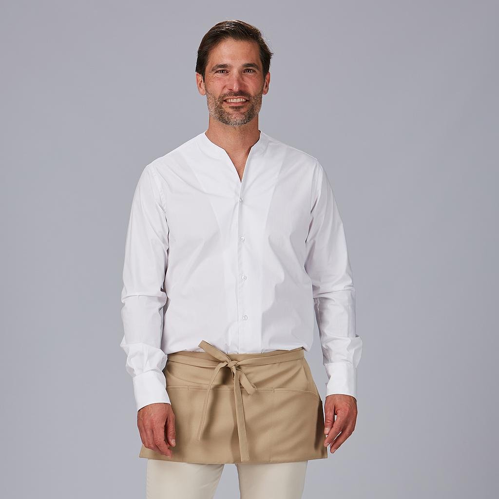 Su diseño corto proporciona comodidad y libertad de movimiento, mientras que los tres bolsillos delanteros ofrecen espacio adicional para utensilios esenciales. Las cintas para anudar, confeccionadas del mismo tejido, aseguran un ajuste seguro y personalizado, añadiendo un toque de elegancia al uniforme de camareros, chefs y personal de servicio.