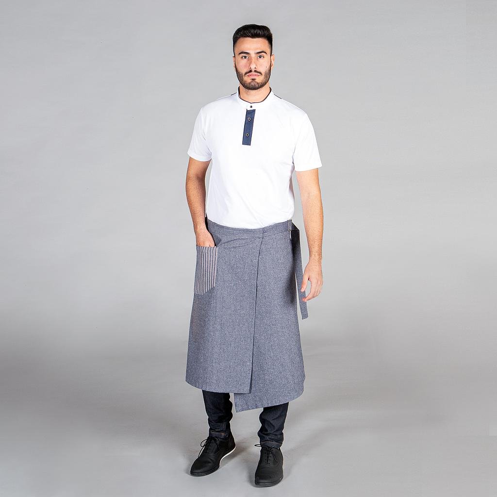 El cierre cruzado tipo pareo, ajustable mediante cinta y hebilla, no solo garantiza un ajuste cómodo y seguro, sino que también añade un toque de estilo francés al uniforme. Equipado con un bolsillo en el lateral derecho, este delantal ofrece conveniencia y espacio para llevar consigo pequeños utensilios o libreta de pedidos.