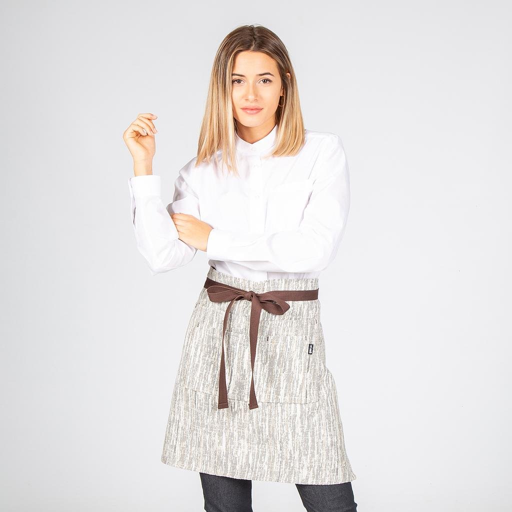 Nuestro delantal sin peto se distingue por su tejido de efecto marmolado en tonos de gris. Este diseño original añade un toque de elegancia y sofisticación a su uniforme, resaltando su compromiso con la excelencia en el servicio y su atención al detalle.