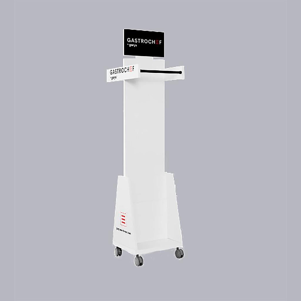 Expositor desmontable de suelo, fabricado en melamina blanca y estampado con los colores corporativos y el logo de Gastrochef by Gary’s. Capacidad para 20 perchas. Ideal para chaquetillas.