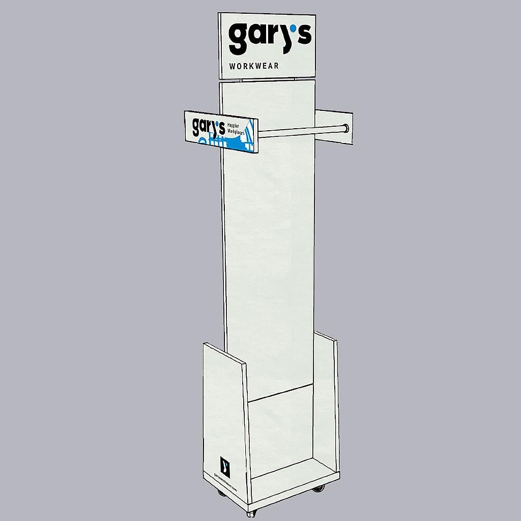 Expositor desmontable de suelo, fabricado en melamina blanca y estampado con los colores corporativos azul, negro y blanco y el logo de Uniformes Gary’s. Capacidad para 20 perchas. Ideal para chaquetillas y blusas.