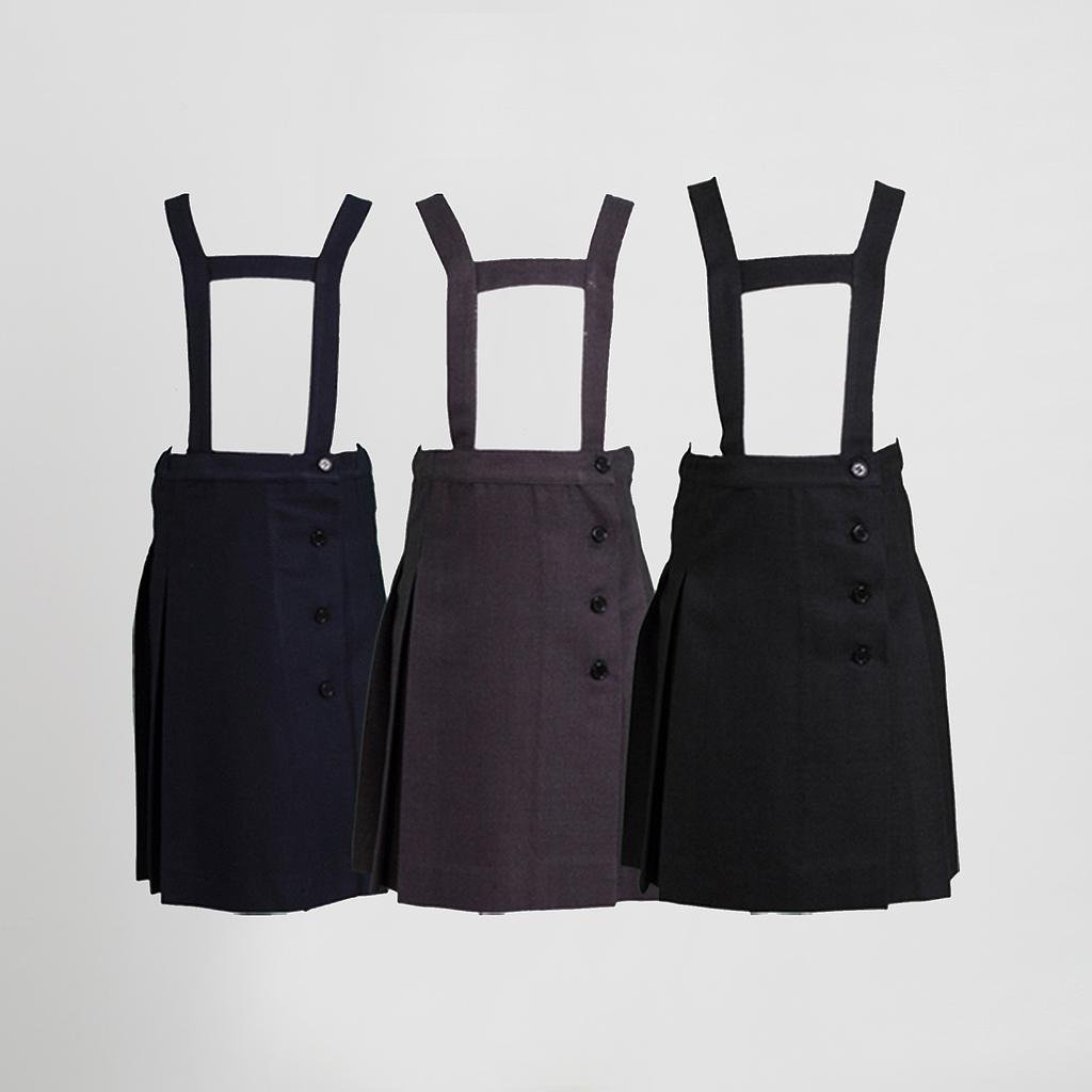 La falda pliegues con peto está disponible en tres colores: marino, gris claro y gris marengo.