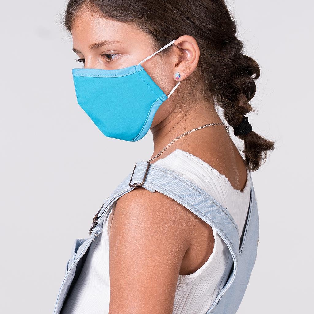 Mascarilla reutilizable para niños, confeccionada con MICROFIBRA ANTIBACTERIANA de 100% Poliéster y doble capa de POLIPROPILENO, que actúa como filtro. Disponible en varios colores lisos.