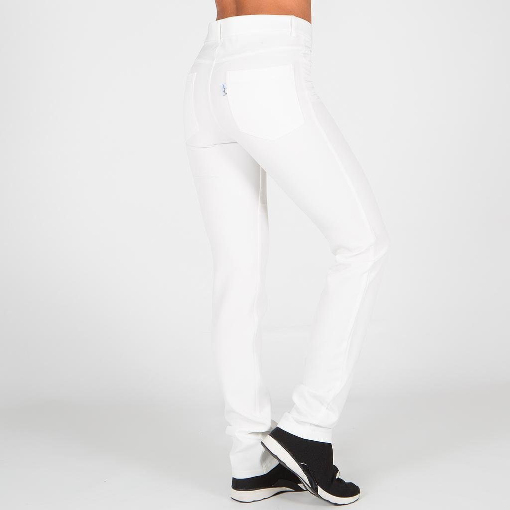 Cinturilla, botón y cremallera. 2 bolsillos tejanos delanteros y un relojero. 2 bolsillos de parche traseros. Tejido elástico. Largo aprox.: 109cm. M1.