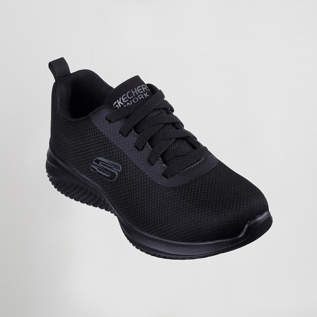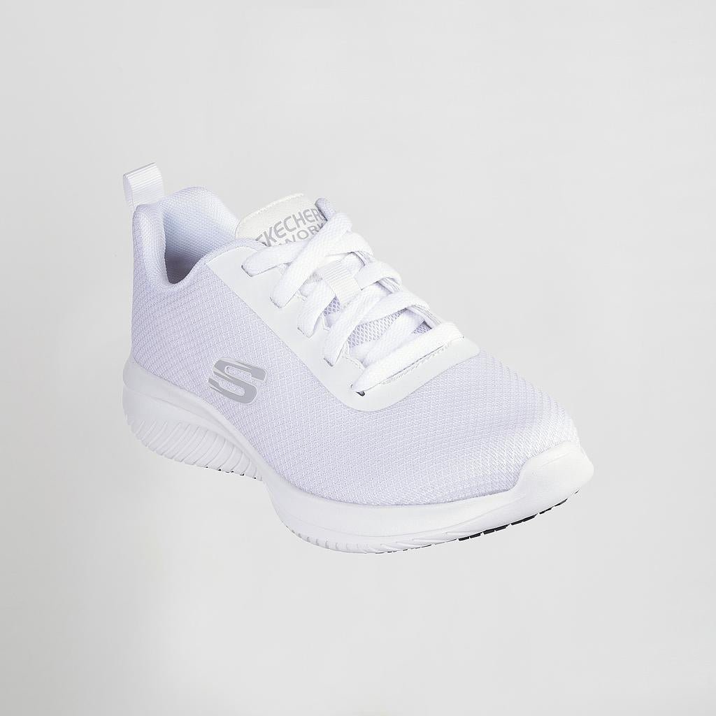 Suela antideslizante (SR) para una mayor tracción en superficies húmedas, secas, aceitosas y grasientas. Plantilla acolchada Skechers Memory Foam™ para mayor comodidad. Diseño Relaxed Fit® para un ajuste cómodo y espacioso en la puntera y el antepié. Parte superior de malla y sintética con cordones en la parte delantera. Tacón de 3,2 cm. Detalle del logotipo de Skechers®. Lavable a mano.